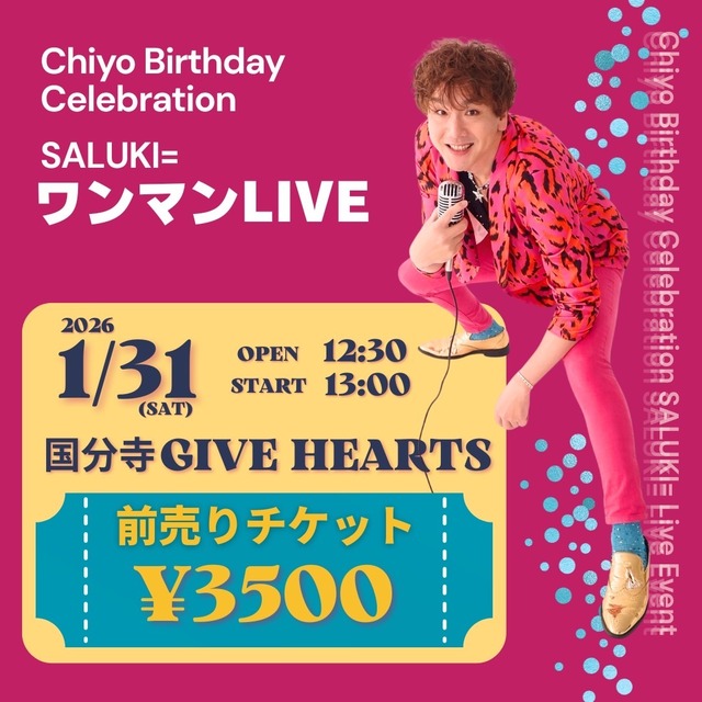 CHIYOバースデイ記念サルーキ=ワンマンLIVEチケット(全席自由) ◯公演日時 2026/1/31(土) Open 12:30 Start 13:00 ◯会場 東京/国分寺ギブハーツ 東京都国分寺市本多2丁目1-4 ◎チヨ誕生日当日にサルーキ=お昼のワンマンLIVEが決定!! いつものメンバーでたっぷり音楽をお届けします♪ 出演/サルーキ= CHIYO(Vo) 森モーリー剛(Gt) 田中翼(Dr) にしだみーこみさこ(Pf) ☆チケット購入の方には全員椅子席あります。 ☆入場順→チケット整理番号順(自由席) ☆開場時間以降にお越しのお客様は列最後尾にてお並びください。 ☆整列は開場時間直前にスタッフが整列を行いますので、開場時間の5分前にお越しください。 ◎お問い合わせ ギブハーツ 0423284316 サルーキ=事務局 [email protected]